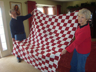 My Dad was on his way to my sister Karens house and stopped by to show us the quilt he had made for her! Is he fast or what? I could not believe that he had it made it already. I talked to Karen on the phone and she LOVES it. She already had it on her bed.